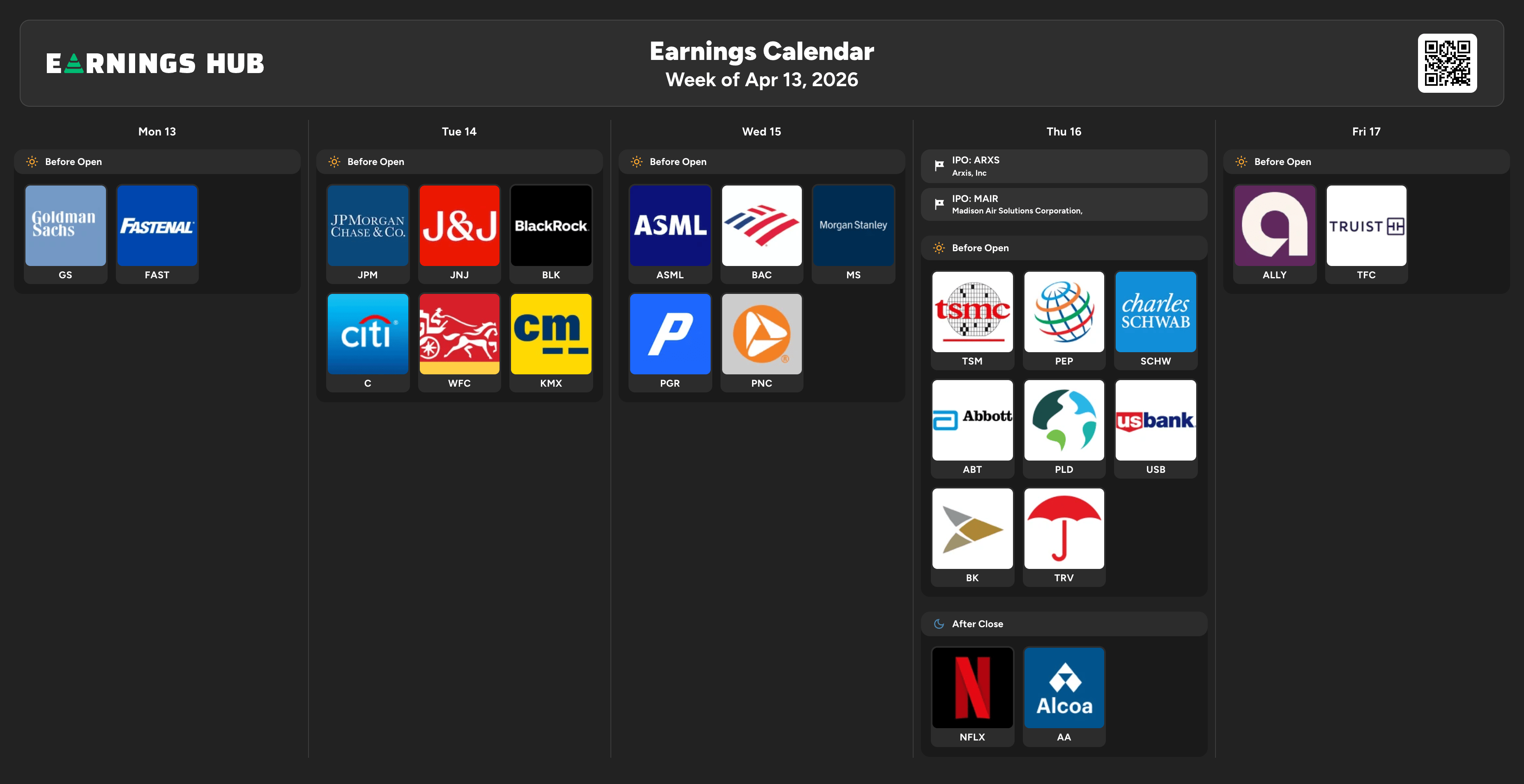 Q1 earnings season also gets underway, starting with the big banks. What they say often matters more than the numbers themselves. Investors are looking for signs that consumers are still spending, loans are growing, and businesses are staying active despite higher rates and global uncertainty. Goldman Sachs, JPMorgan, Citigroup, Wells Fargo, and BlackRock are all in the spotlight.